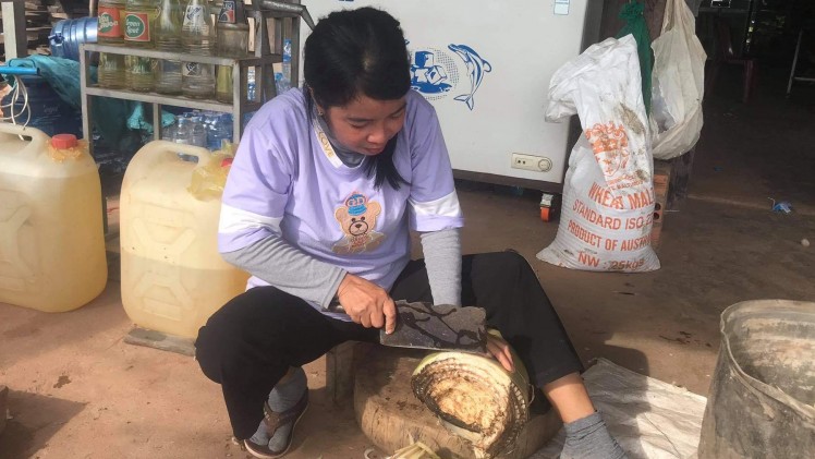 Sok Romonea is slicing up a banana tree to feed her chickens